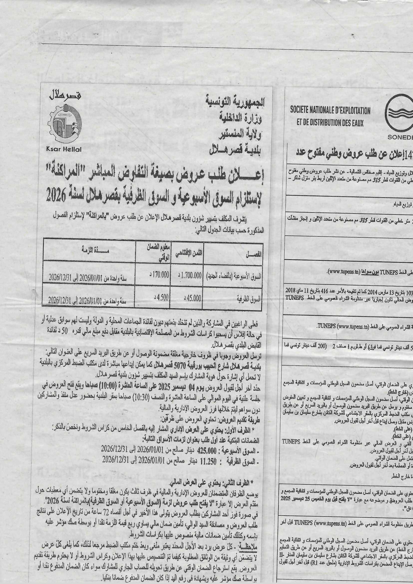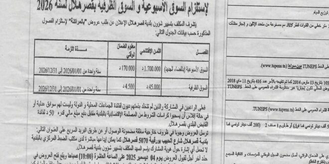 الاعلان عن طلب عروض بصفة التفاوض المباشر “المراكنة” لاستلزام السوق الاسبوعية والسوق الظرفية بقصر هلال لسنة 2025 admin 26 نوفمبر 2025 آخر المستجدات, إعلانات اضف تعليق 6 زيارة شاركها Facebook Twitter Google + Stumbleupon LinkedIn Pinterest مقالات مشابهة محضر جلسة ادارية بتاريخ 29-12-2025 8 يناير 2026 محضر جلسة ادارية بتاريخ 19-12-2025 8 يناير 2026 اعلام طلب عروض بصيغة الظروف المغلقة لاستلزام السوق الاسبوعية بقصر هلال لسنة 2026 8 يناير 2026 شاركها Facebook Twitter Google + Stumbleupon LinkedIn Pinterest
