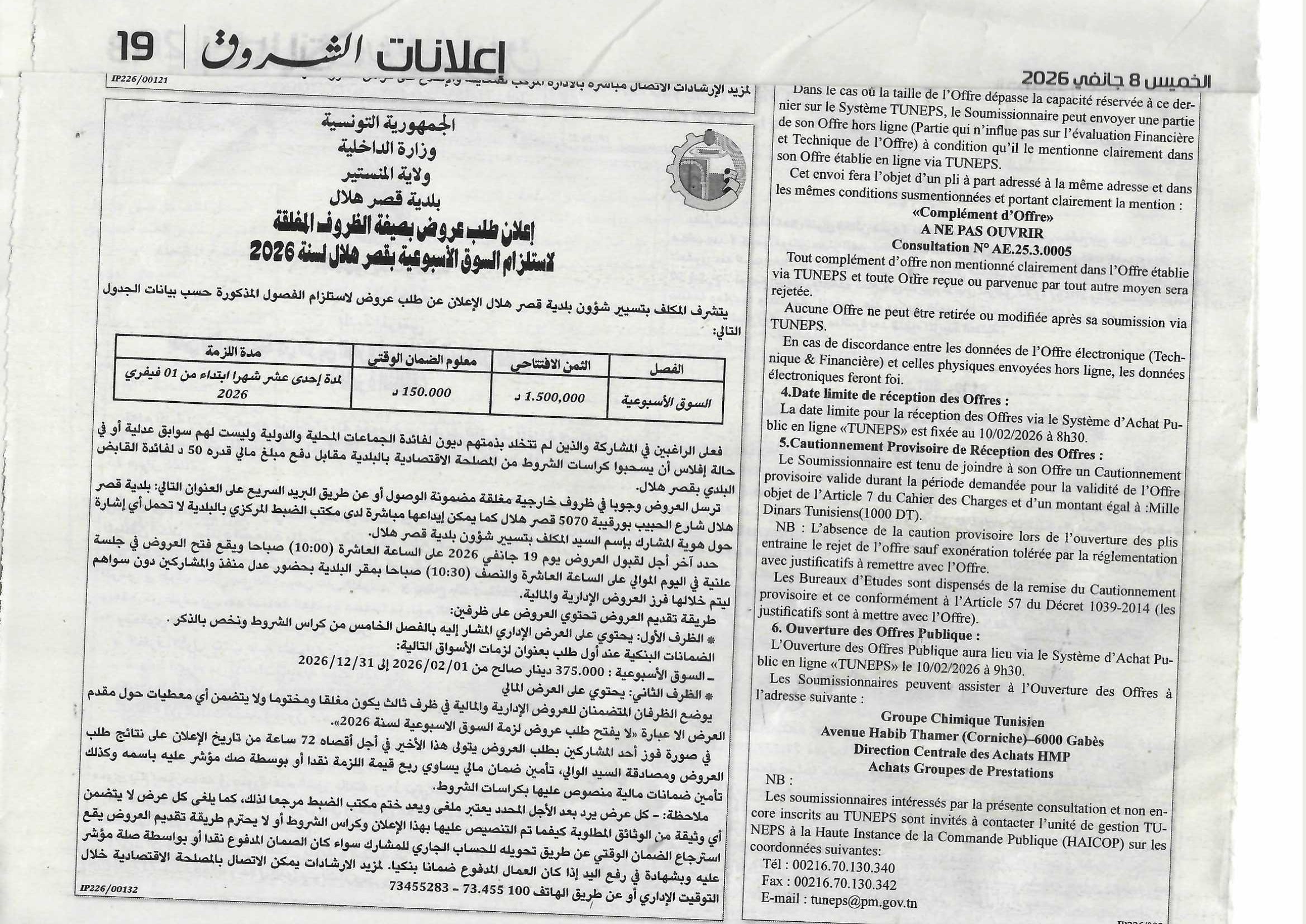 اعلام طلب عروض بصيغة الظروف المغلقة لاستلزام السوق الاسبوعية بقصر هلال لسنة 2026 admin 8 يناير 2026 آخر المستجدات, إعلانات اضف تعليق 2 زيارة شاركها Facebook Twitter Google + Stumbleupon LinkedIn Pinterest مقالات مشابهة محضر جلسة ادارية بتاريخ 29-12-2025 8 يناير 2026 محضر جلسة ادارية بتاريخ 19-12-2025 8 يناير 2026 إعلان طلب عروض بصيغة التفاوض المباشر – المراكنة – لإستلزام السوق الأسبوعية و السوق الظرفية و السوق اليومية بقصرهلال لسنة 2026 للمرة الثالثة 24 ديسمبر 2025 شاركها Facebook Twitter Google + Stumbleupon LinkedIn Pinterest