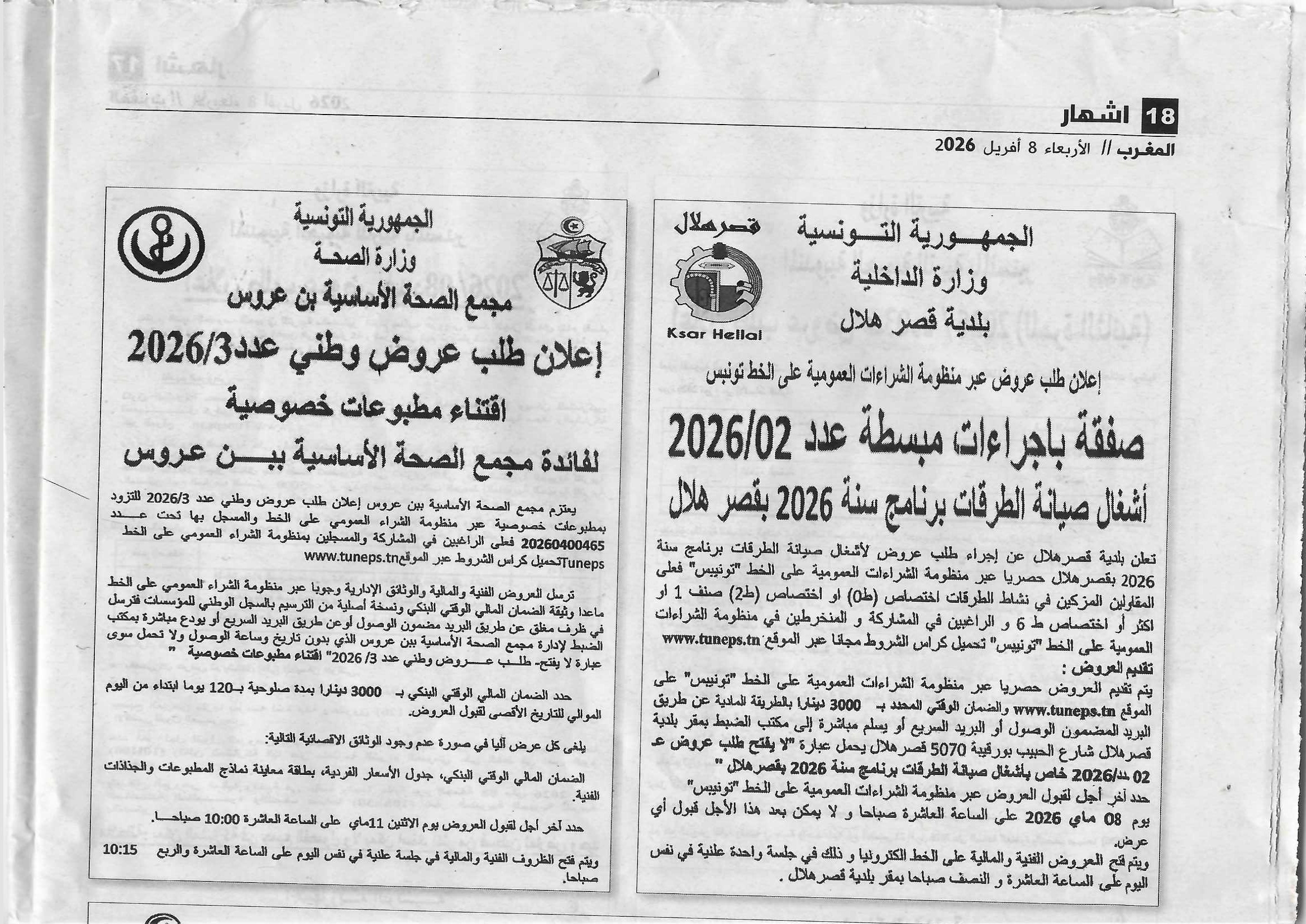 الاعلان عن صفقة بالاجراءات المبسطة عدد 2026/02 أشغال صيانة الطرقات برنامج سنة 2026 admin 8 أبريل 2026 آخر المستجدات, إعلانات اضف تعليق 1 زيارة شاركها Facebook Twitter Google + Stumbleupon LinkedIn Pinterest مقالات مشابهة محضر جلسة ادارية بتاريخ 03 مارس 2026 18 مارس 2026 محضر جلسة عمل ادارية بتاريخ 16 فيفري 2026 24 فبراير 2026 محضر جلسة عمل ادارية بتاريخ 09 فيفري 2026 24 فبراير 2026 شاركها Facebook Twitter Google + Stumbleupon LinkedIn Pinterest